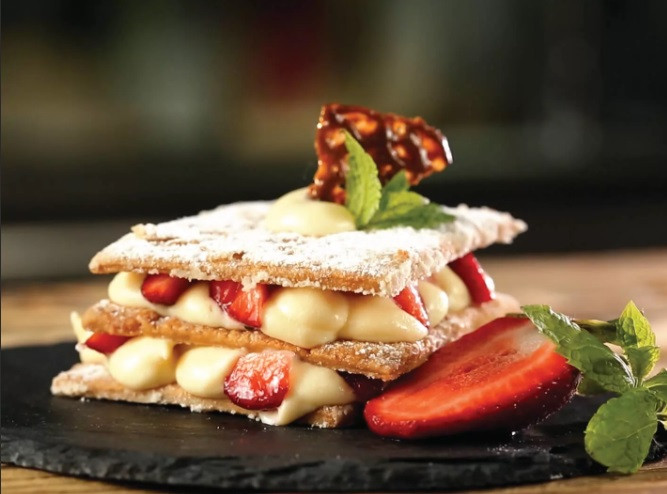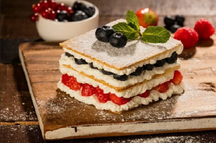 Французский десерт мильфей (на французском mille-feuille, произносится как мильфёй, с ударением на второй слог) состоит из пресного, чаще слоеного теста, ягод и заварного крема – в этом смысле мало чем мильфей отличается от Наполеона.