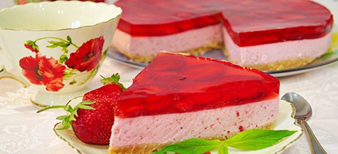 Смешиваем желтково-сырную смесь и белки в несколько приемов, перемешиваем движениями снизу вверх. Положить корж в формочку, сверху налить крем. Отправить минут на шестьдесят в холодильник, чтобы схватился крем. Порезать клубнику на кусочки, выложить на застывший крем. Готовим желе по инструкции, остужаем до комнатной температуры, заливаем клубнику. Поставить торт с маскарпоне и клубникой в холодильник на 4 часа.