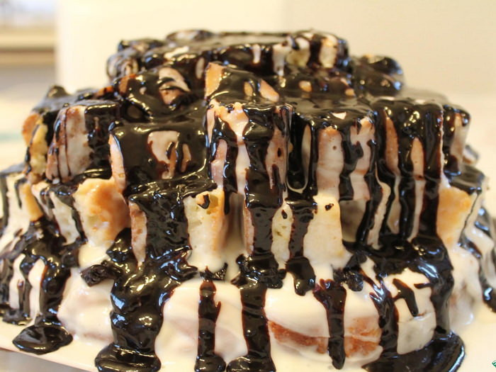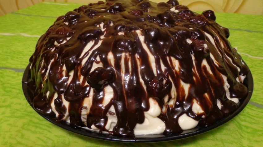 Следите за тем, чтобы каждый кусочек полностью «искупался» в креме со всех сторон. Теперь медленно и аккуратно выкладывайте шоколадные кубики на светлый корж. Торт в результате должен иметь форму небольшой горки. Самое время приготовить глазурь.