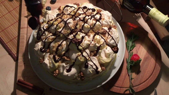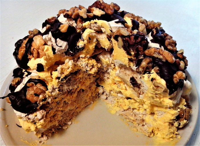 Для этого нужно ложкой обмазывать безе кремом и укладывать горкой на бисквит, поливать растопленным шоколадом при помощи чайной ложки и посыпать сверху измельченными орехами. Торт Графские развалины в домашних условиях готов, , можно рецепт упростить и приготовить этот торт без бисквита, вкус получится ничуть не хуже.