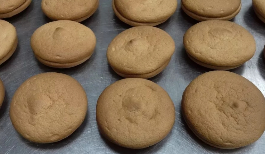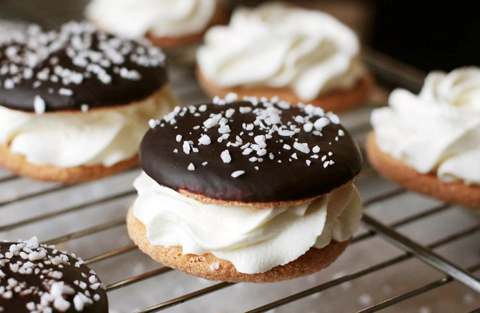 - Нижнюю часть пирожных (лепешки без глазури) с плоской стороны промазываем тонким слоем абрикосового джема. Крем перекладываем в кондитерский пакет и наносим на джемовую прослойку. Накрываем крем лепешками с глазурью, слегка придавливаем.