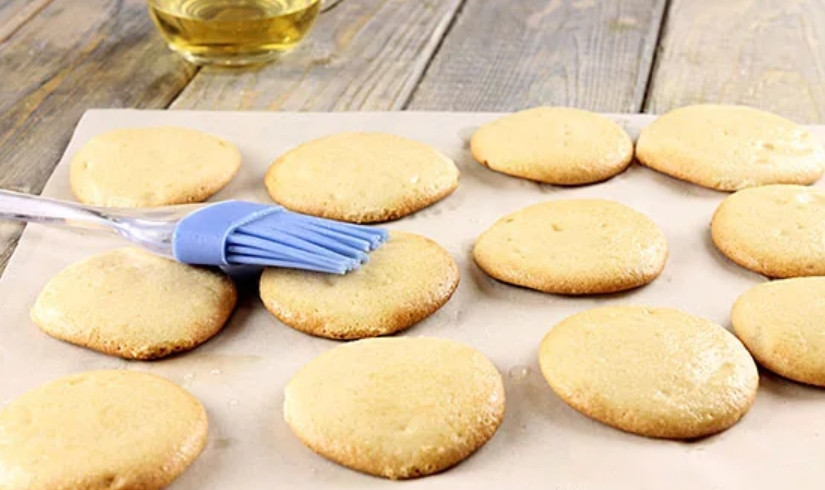 - Выпекаем заготовки в прогретой до 180 градусов духовке порядка 10-20 минут. Важно не пересушить лепешки — они должны хорошо пропечься, но при этом остаться мягкими (готовность стандартно проверяем с помощью спички/зубочистки). Свежеиспеченные бисквиты остужаем.