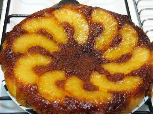 Часть ананасовых колец разложите по дну мультиварки, сверху на них вылейте тесто. Оставшимися кусочками ананаса украсьте «шапку» шарлотки. Установите режим «Выпечка» на 60 – 65 минут. Когда шарлотка с ананасами в мультиварке Панасоник будет готова, щедро украсьте ее сахарной пудрой.