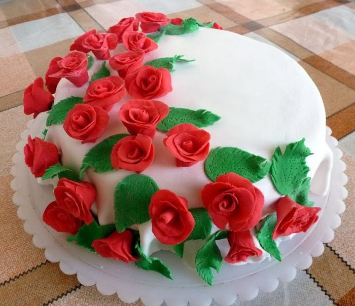 Для декорирования праздничного торта розами необходимы: белая мастика – можно приготовить самим или приобрести готовую; сахарная пудра – для работы с мастикой; формы для вырезания лепестков и листочков; зубочистки для крепежа розочек, вилочка для лимона, ножницы, кисточка; торт – декорировать таким образом можно любой торт, обязательно покрытый кремом под мастику; вода.