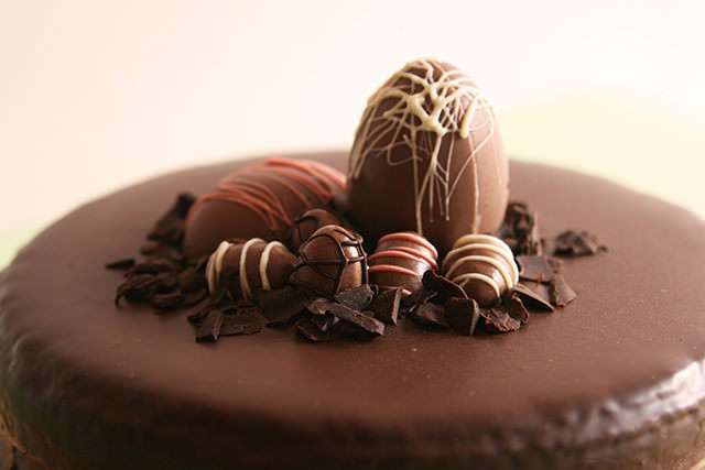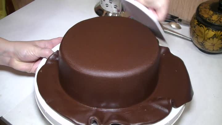 Шоколадную мастику важно не перегревать и не раскатывать очень тонким слоем. Как только тортик обработан и упакован в мастику, отправляем его в холодильник. Шокомастика застынет, обветрится и окончательно примет форму. Когда шоколадная мастика застывает, она не твердеет (по ней не постучишь) и не становится жесткой, благодаря входящему в состав маслу.