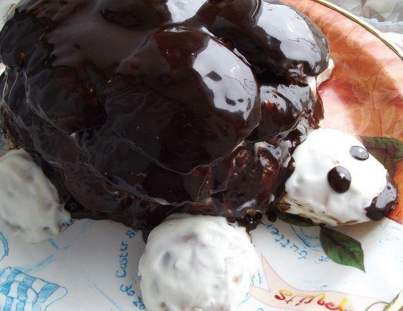 Помните! Лучше каждую лепешку обмакнуть в крем и только потом уложите ее на сервировочное блюдо. Так тортик получится сочным и мягким.Также выложите голову, ножки и лапки с хвостиком черепашки. Шоколадную глазурь сделайте из сметаны, сливочного масла, сахарного песка и какао. Все продукты смешайте и доведите смесь до кипения и только потом внесите шоколад. После ею облейте подготовленную горку. Нарисуйте глазки и ротик.