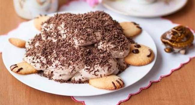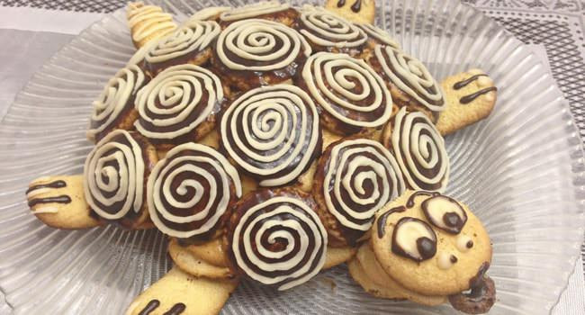 Торт «Черепашка» отличается от других тортов, так как для него выпекаются не коржи, а небольшое бисквитное печенье, которое потом окунается в крем и собирается горкой. Торт получается нежным, мягким с приятным вкусом сметанного или шоколадного крема, а завершает все это великолепие шоколадная глазурь, которой покрывается вся поверхность торта.