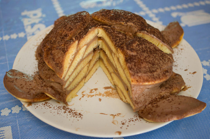 Заготовки поместите в миску или в кастрюлю друг на друга, чтобы они не засохли. Соберите торт. Для этого окунайте каждую лепешку в крем и выкладывайте друг на друга, придавая форму купола или панциря. Для украшения используйте орехи, измельченное печенье, тертый или расплавленный шоколад.