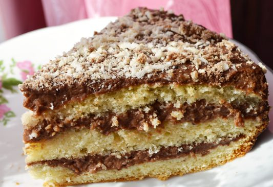- Смазать коржи кремом, посыпать орехами и шоколадом.