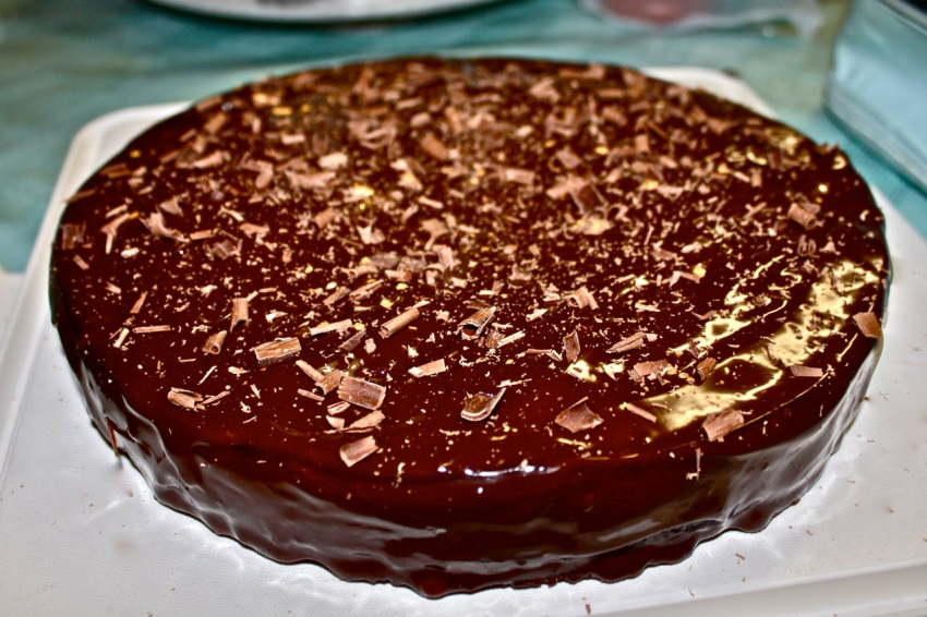 - Вылейте глазурь на торт сверху и лопаточкой распределите таким образом, чтобы глазурь не доходила примерно сантиметр до краев торта. Аккуратно подталкивая глазурь к краям, сформируйте шоколадные подтеки.