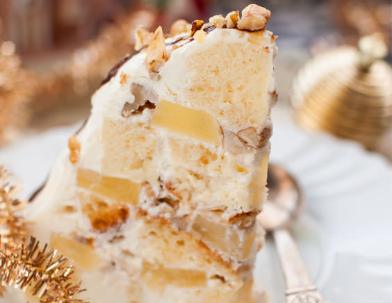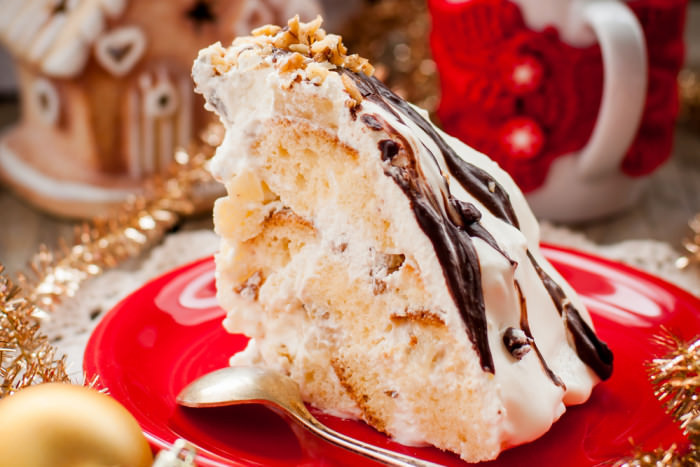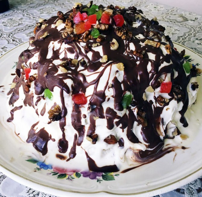 После орехов – слой ананасов, далее снова слой бисквита с кремом, так повторяем, пока ингредиенты не кончатся. Сверху положить целый корж бисквита, пленку завернуть, сверху придавить тарелкой. Перевернуть, снять пленку, полить сверху растопленным шоколадом.