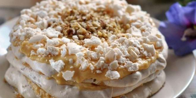 Крем готовится путем взбивания охлажденных белков с сахарной пудрой. Сформируйте торт, чередуя коржи с белковой прослойкой. Готовое блюдо оставьте в прохладном месте настояться и пропитаться в течение 6-8 часов.