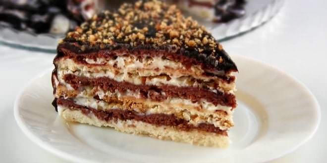 Хорошо промазывать коржи, чередуя темные и светлые. Верх залить шоколадной глазурью: 3 ст. л. молока, 4 ст. л. сахара, 3 ч. л. какао смешать, довести до кипения, добавить 50 г. слив. масла и кипятить 1-2 минуты покрыть торт сверху и с боков. Дать застыть.