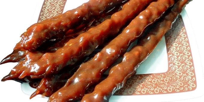 Чурчхелой называют лакомство, которое готовится на основе цельных и колотых орехов. Обычно используются лесные орехи или грецкие, их нанизывают на плотную нитку, а затем покрывают плотной глазурью из виноградного или гранатового сока. Десерт нравится не только взрослым, но и маленьким детям, кроме того он абсолютно натуральный и очень полезный.В оригинальном исполнении грузинского лакомства, хозяйки использовали грецкие орехи, только они могли входить в состав чурчхелы. Но позднее рецепт десерта стал известен в других странах, и в рецептуру ввели изменения, тогда и стали использовать миндаль и лесной орех.