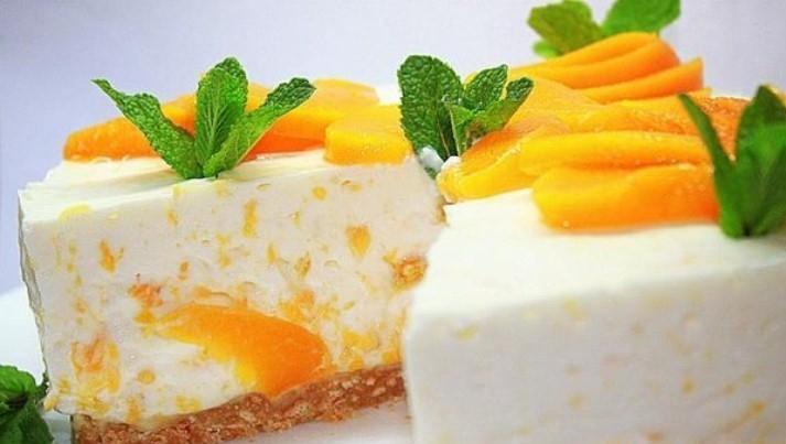Йогуртовую смесь перелейте в форму и поставьте в холодильник на 6–8 часов. Перед подачей к столу украсьте торт кусочками персика.