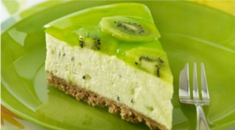 Киви мелко нарезать. Соединяем с оставшимся сахаром и провариваем на медленном огне до растворения сахара. Теперь добавляем желатин и снимаем кастрюлю с огня. Достаем тесто раскатываем тонко и вырезаем круг по форме. Лишнее тесто убираем в морозилку , оно ещё пригодиться для разной выпечки.