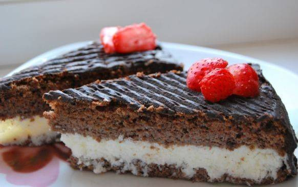 Коржи пропитайте сливками. На один равномерно нанесите крем, сверху положите другой и слегка придавите. Также в мультиварке готовим глазурь. В чаше соедините все ингредиенты для глазури и варите в режиме «Тушение», пока масса не станет густой. Полейте ею торт сверху и по бокам и оставьте на ночь десерт в холоде.