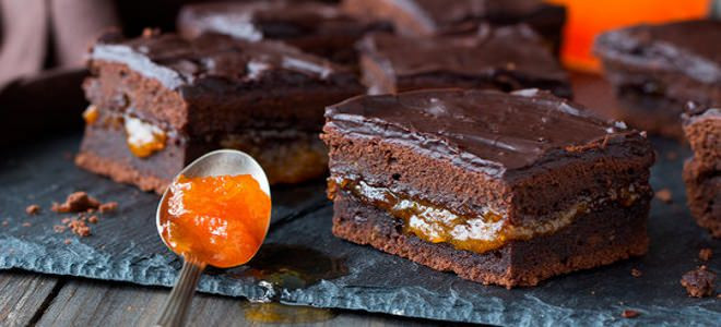 Разрезаем корж на 2 части, нижний пропитываем соком. Выкладываем конфитюр, равняем, накрываем вторым коржом и еще немного пропитываем его апельсиновым соком. Для глазури необходимо растопить шоколад с молоком на водяной бане. Как только масса станет однородной полить глазурью торт и разровнять по поверхности и бокам. Убираем на ночь в холодильник