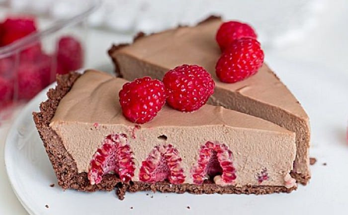 Шоколадный торт без выпечки с муссом и малиной