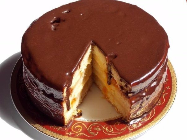 Охлаждённый до комнатной температуры крем равномерно распределить по коржу, накрыть второй частью бисквита и отправить заготовку в холодильник минут на 20. На водяной бане растопить 100 г темного шоколада и 75 г сливочного масла. Охлажденный торт покрыть глазурью, украсить на свое усмотрение.
