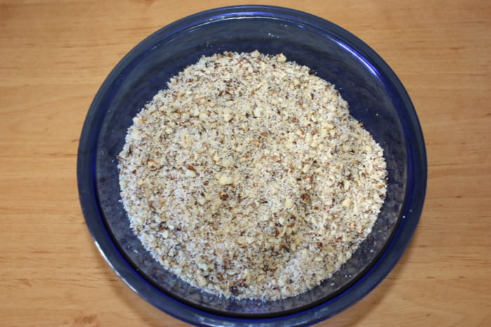 - 1 кг грецких орехов (оставьте для украшения штук 20 половинок ореха для украшения) измельчить в блендере мелко, но так чтобы кусочки орешков чувствовались на зубах. Размер примерно с горошину черного перца. Смешать с 1 кг сахара и добавить молотый кардамон. Я еще добавляю ванильный сахар.