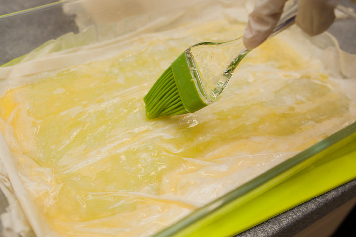 Накройте листы теста куском пищевой пленки и слегка влажным кухонным полотенцем, т.к. тесто фило очень быстро сохнет, если его не накрыть. Установите решетку в центр духовки и разогрейте ее до 180°С. Положите 1 из листов теста фило на дно смазанной сливочным масло формы и слегка смажьте небольшим количеством растопленного сливочного масла. Повторите процесс с еще 6 листами теста, чтобы всего получилось 7 слоев.