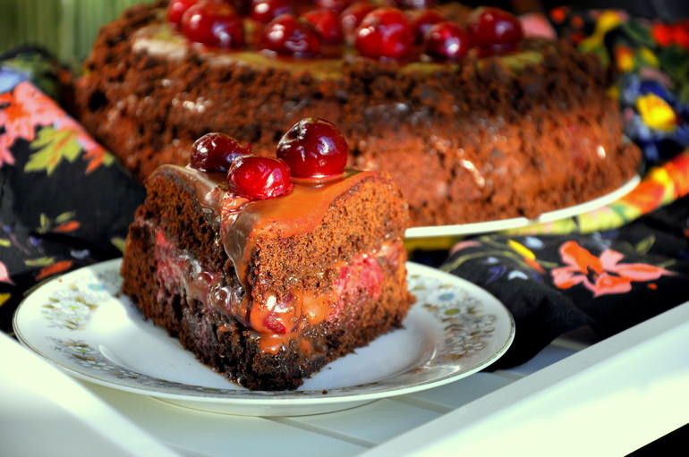 Выпекать в форме с съемным дном 24-26 см в духовке при 180 градусах 30–40 минут. Готовый корж остудить на решетке. Вишню засыпать 50 граммами сахара и оставить на десять минут, чтобы вишня дала сок. Немного вишни оставить для украшения.