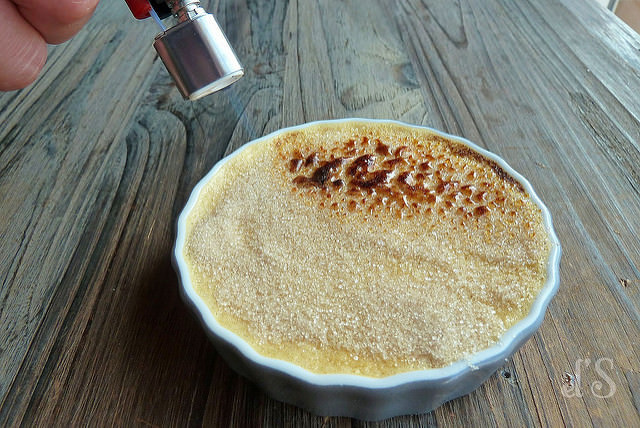 После приготовления крема дать ему остыть и положить в холодильник минимум на 2 часа. Перед тем как подать присыпать сливками с сахаром. Сахар карамелизировать при помощи гриля или газовой горелки.