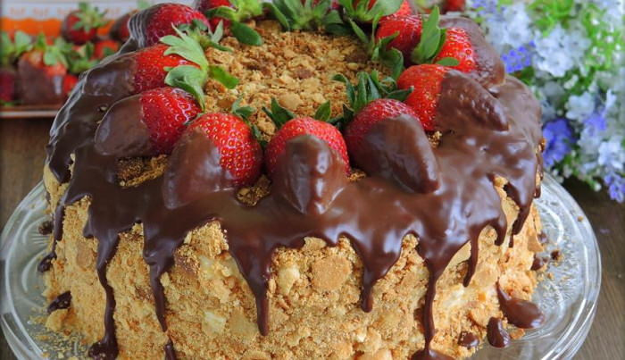 - Готовые коржи обильно смазать кремом, оставив 2-3 коржа на крошку и немного крема для обмазывания. Оставить сначала при комнатной температуре на 1-2 часа, затем убрать в холодильник еще на 5-6 часов. Ровно обмазать готовый торт кремом и обсыпать крошкой. Украсить по своему желанию.