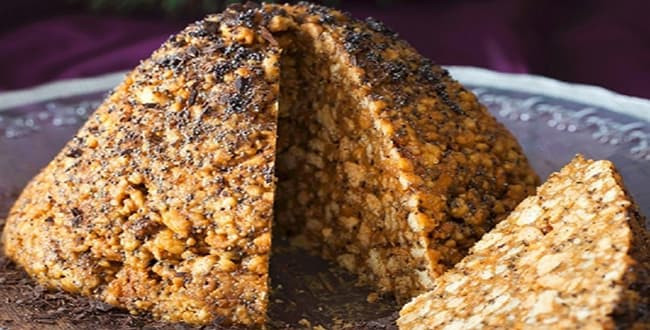 Для крема: смешать вареное сгущенное молоко и масло, взбить, пока масса не станет пышной. В крем сразу добавляют измельченные грецкие орехи. Покрошить тесто и залить кремом, выложить торт горкой. С помощью мака украшают десерт со всех сторон. Положить в холодильник на несколько часов.