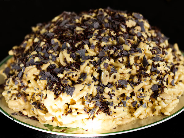 Для крема масло сбиваем при помощи миксера со сгущенкой. Достаем «червячков» и даем им остыть. Крошим на мелкие кусочки и смешиваем с кремом. Выкладываем горкой на блюдо и руками формируем конусообразную форму муравейника. Сверху можно посыпать потертым на терке шоколадом. До подачи на стол торт желательно охладить в холодильнике 1-2 часа.