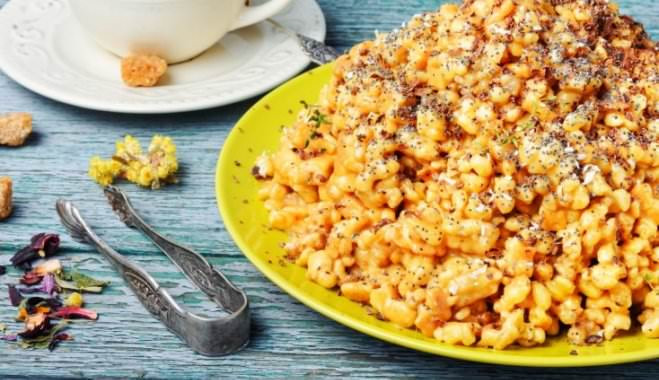 Некоторые трут тесто на терке, пропускают его через мясорубку. Смысл в получении меленьких кусочков из теста, которые запекаются при 180 градусов до румяного цвета (примерно 20-25 минут, в зависимости от тонкости теста)