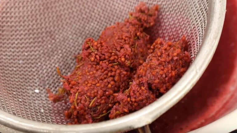 - Затем возьмите сложенную в несколько слоев марлю или другую плотную ткань и через нее отожмите из ягод сок. Делайте это порционно, стараясь сок отжать максимально. Кухонную технику для отжима сока не используйте, так как получится иное качество желе.