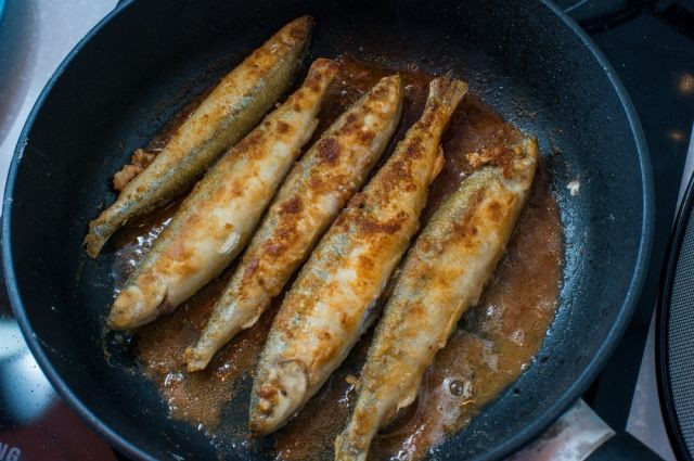 - Затем заливаем масло в сковороду, а когда оно нагреется, начинаем жарить рыбу в течение 15 минут со всех сторон.