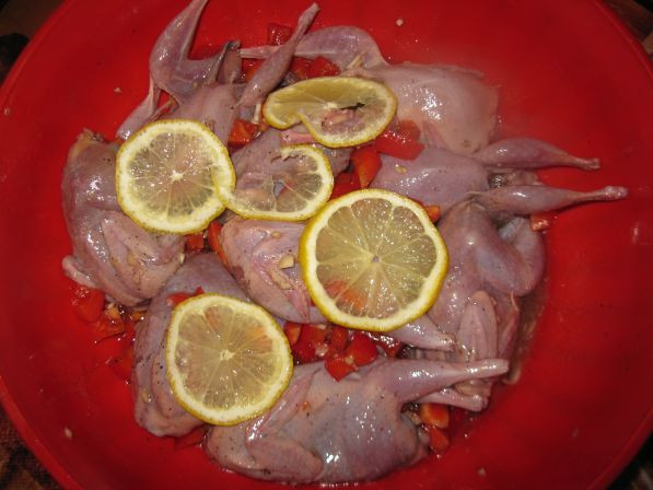 В большой емкости кладем тушки перепела, замачиваем водой и кусочками лимона. Даем постоять не более 30 мин. Лимон придаст мясу мягкость и сочность при готовке в духовке. Не старайтесь сделать классический маринад для мяса и не добавляйте уксуса, майонеза или кефира. Несколько долек лимона вполне хватит для того чтобы мясо было нежным и сохранило великолепный вкус.