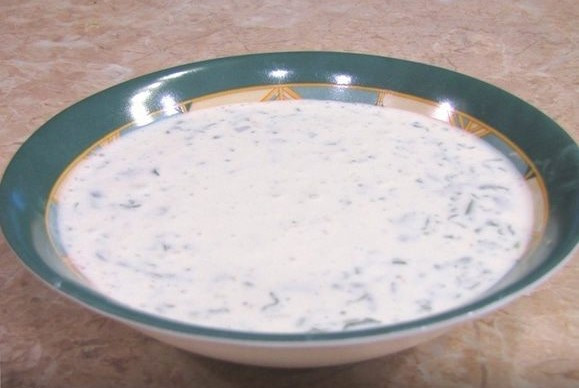 В небольшую миску выкладываем сметанку, добавляем пропущенный через пресс чеснок, зелень, пряные травки и перемешиваем. Оставляем на время пока готовим фарш для перепела.