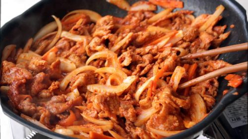 - Когда раскалится, выкладываем кусочки свинины, и обжариваем мешая 5 минут.