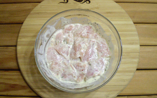 - Размешиваем, слегка прижимаем руками и маринуем не меньше двух часов. Если используется телятина, то желательно оставить на 10 часов.