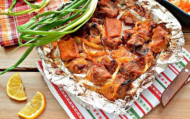 - Аппетитный домашний шашлык в духовке в фольге из свинины у нас приготовился. Подаем его с овощными дополнениями в виде салатиков или просто свежей зелени. Уместен будет и ваш любимый соус.