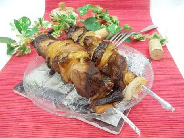 - Остается только нанизать на каждую шпажку по очереди мясо с салом и луком и уложить эти красивые «конструкции» на бортики глубокого противня.