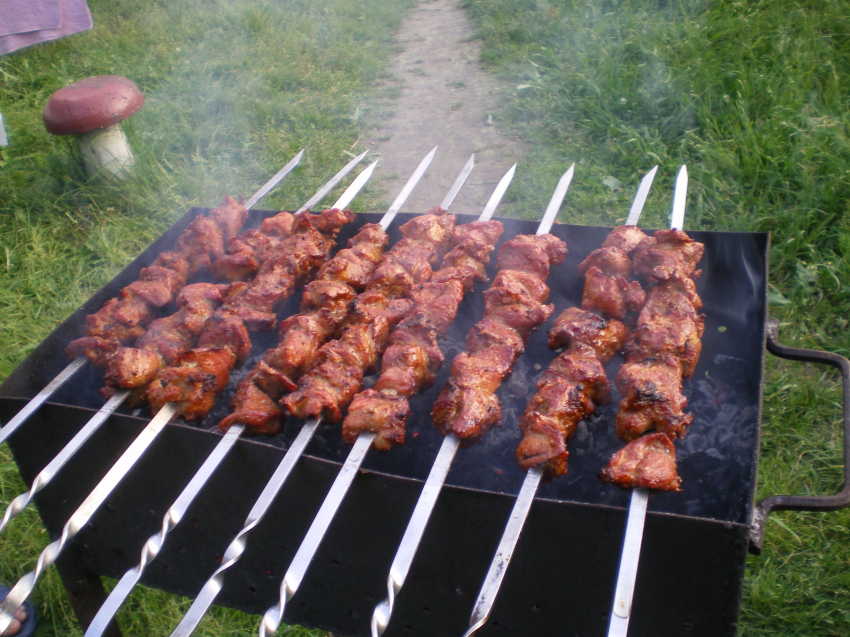 - А далее вам только останется надеть мясо на шампура, довести угли в мангале до нужного состояния и пожарить шашлычок. После этого устроить его уничтожение в компании с друзьями или семьей на свежем воздухе, путем поедания. Поддерживая, при этом, хорошее настроение.