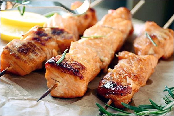- лосось – хорошо сохраняет свою форму, не разваливаясь на части при жарке. Эта рыба менее жирная по сравнению с форелью или семгой, поэтому шашлык из нее можно назвать диетическим;