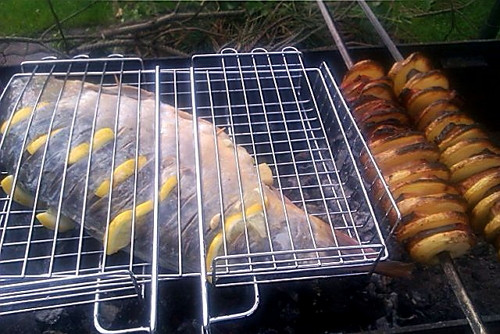 - Потом разжигаем мангал, кладем рыбку на решетку и жарим на гриле с двух сторон до золотой корочки.