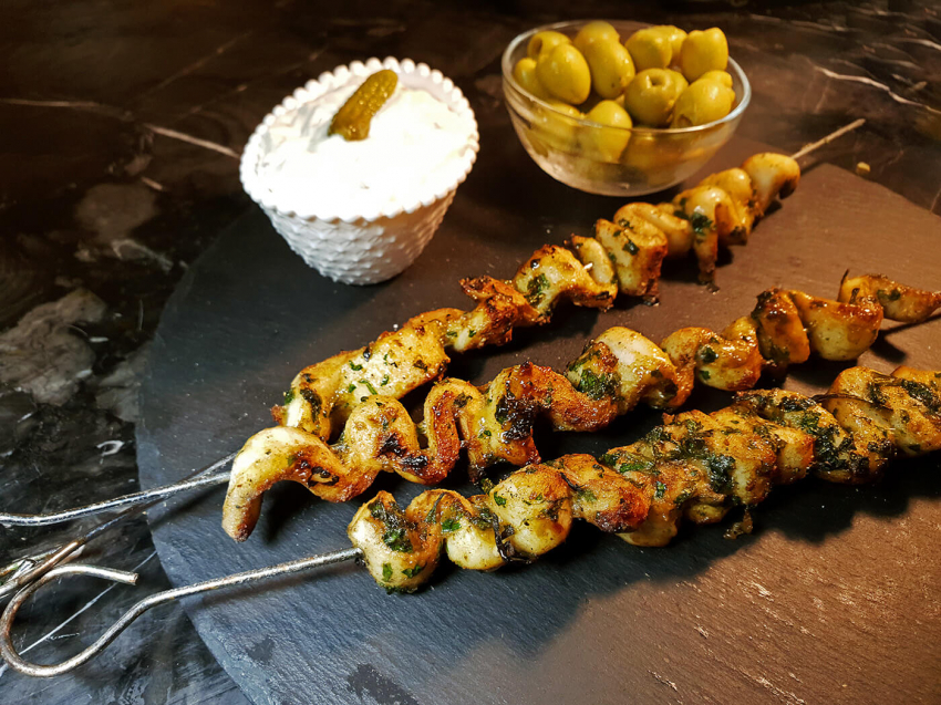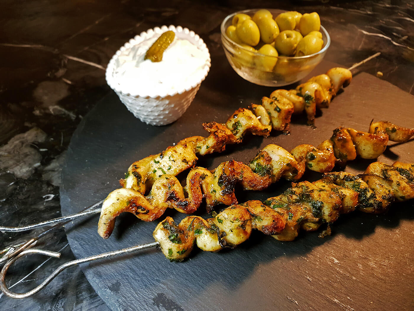 - Обжаривать кальмары на шпажках со всех сторон по 1 минутке. При желании можно повторить процедуру.