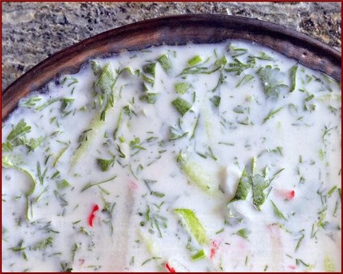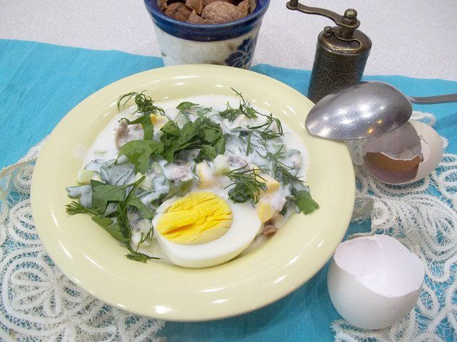 - Перелить окрошку по-азербайджански в тарелки и подать к столу. Приятного аппетита!