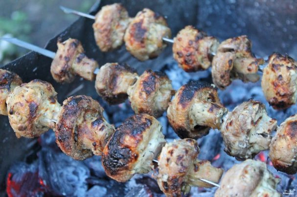 - Нанизывайте шампиньоны на шампур осторожно, чтобы они не развалились. Затем кладите на мангал и обжаривайте, переворачивая, как только одна сторона зарумянится.