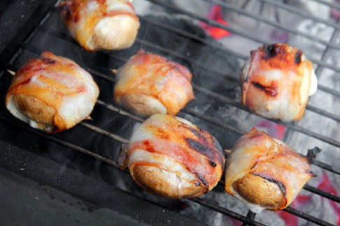 - Предварительно разжигаем угли и ждем когда они прогорят. Для приготовления этого блюда, нам потребуется решетка для барбекю, если таковой нет под рукой, можно обычную решетку разместить на мангале. Теперь выкладываем заготовки в беконе на решетку.
