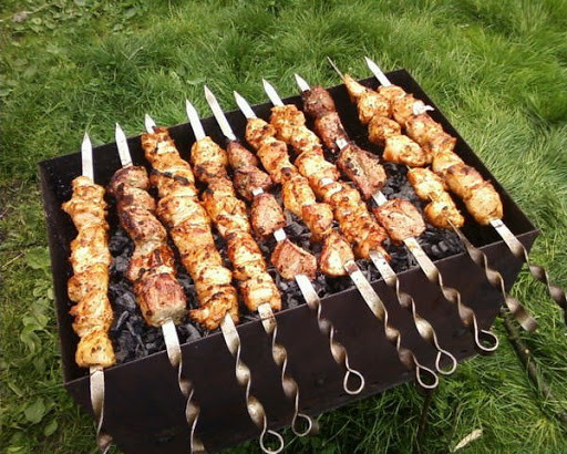 — Шампур обязательно должен проходить поперек волокон. Если шампур проходит вдоль, то он раздвигает волокна и сок вытекает по шампуру, а если поперек, то он как бы «сшивает» волокна.Нанизывайте мясо достаточно плотно. Если используете сало, то перемежая кусочки мяса и сала.