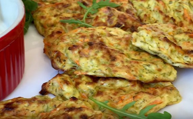 В первом рецепте очень мало калорий, но много овощей. Еще сюда входит нежный сыр фета. Он достаточно соленый, поэтому блюдо солить не стоит. Можно обойтись и без него, если Вы желаете совсем совсем диетические оладьи. Но при этом добавьте побольше муки, чтобы тесто не было слишком жидким.