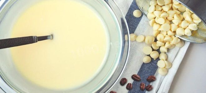 Ганаш белый для покрытия торта готовится по идентичной технологии, но имеет несколько иные требования по пропорциям базовых составляющих. Для получения густого крема, которым удобно покрывать поверхность десерта и одновременно его выравнивать понадобится 3 части белого натурального шоколада высокого качества и 1 часть жирных сливок. Для чуть более жидкого ганаша на 1 часть сливок добавляют 2 части шоколада.